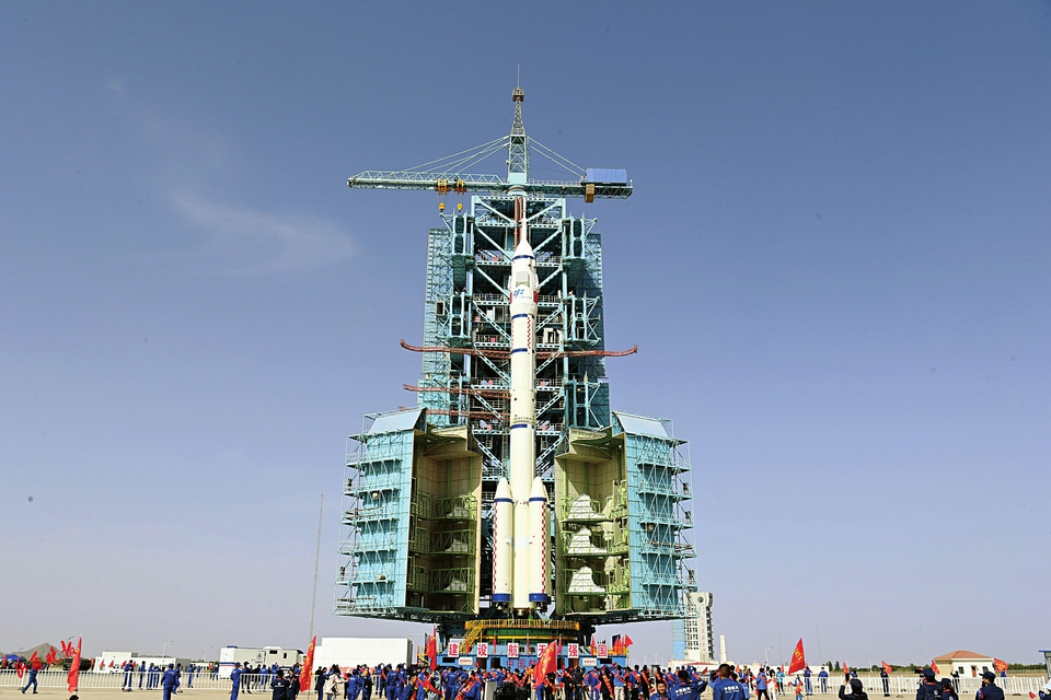 圖為5月22日,神舟十六號載人飛船與長征二號F遙十六運載火箭組合體轉(zhuǎn)運至發(fā)射塔架。