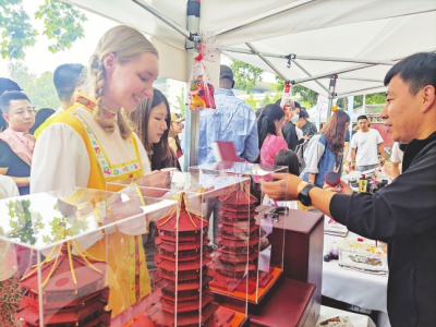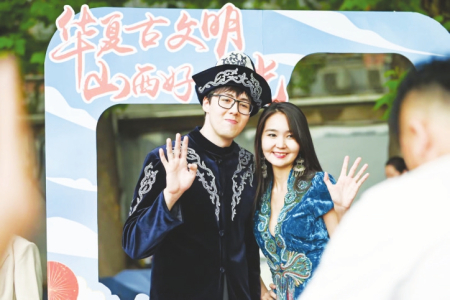 當(dāng)日活動(dòng)吸引了來自世界各地的3萬余名師生及社會(huì)各界人士。獨(dú)唱《人說山西好風(fēng)光》《千年一塔》,舞蹈《醋之韻》《翼城花鼓》等贏得師生們熱烈掌聲。在五大洲文化展區(qū),絳州木版年畫傳承人吳百鎖現(xiàn)場(chǎng)印制木版年畫贈(zèng)送師生,成為一道亮麗風(fēng)景。廣靈剪紙、應(yīng)縣木塔模型、黎侯虎、寧武毛健茶等吸引各國留學(xué)生駐足欣賞。“華夏古文明山西好風(fēng)光”主題相框前,無數(shù)外國友人饒有興趣交流互動(dòng),拍照留念?!吧轿髟亍被鸨本┱Z言大學(xué)世界文化節(jié)。