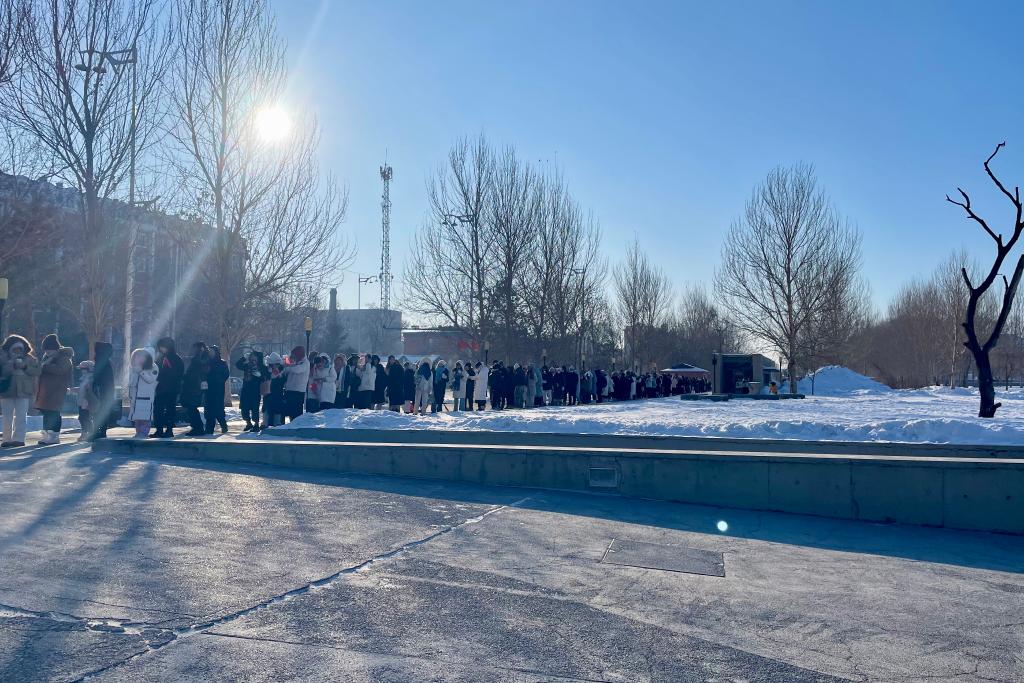 9日早上,哈爾濱氣溫低至零下20攝氏度,陳列館外早已排起長(zhǎng)隊(duì)。為了迎接高峰,陳列館延長(zhǎng)開放時(shí)間,游客通過網(wǎng)上預(yù)約可免費(fèi)入館參觀,還有志愿者送上熱水或玉米糊幫他們驅(qū)寒。