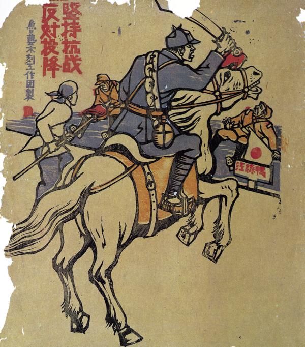 魯藝木刻工作團(tuán)制作的新年畫《堅持抗戰(zhàn) 反對投降》。新華社發(fā)(延安魯藝文化中心供圖)