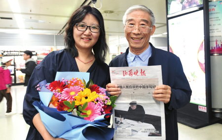 在接站口,“姥爺”接過記者遞上的鮮花,看到刊載報道他的4月2日的報紙,咧嘴一笑,一再說“謝謝,謝謝”,記者用鏡頭和文字記錄下這份喜悅。交城縣委宣傳部也派出了接機(jī)小分隊(duì),打著“我們愛你,山西姥爺”等歡迎牌,把姥爺護(hù)送回家。