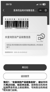 “未查詢到產(chǎn)品銷售信息”,建議等兩天再次掃碼,如還未出現(xiàn),說明售出機(jī)構(gòu)未掃描該盒藥品上的追溯碼,可向售出機(jī)構(gòu)或有關(guān)部門反映。