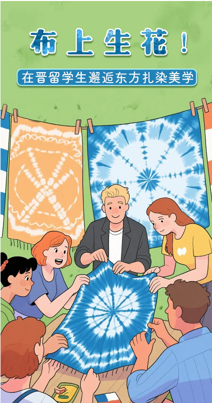 國際青年們認真聆聽扎染的歷史淵源與工藝精髓,并通過分步演示,親自體驗“絞纈”技法。留學生們在素色方巾上折疊、捆扎、浸染,創(chuàng)作出各具特色的紋樣。