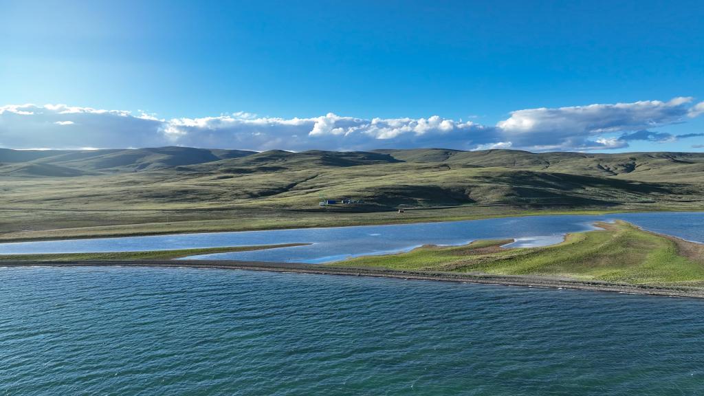 7月25日拍攝的尕日塘秦刻石所在地青海省果洛藏族自治州瑪多縣扎陵湖北岸(無人機(jī)照片)。新華社記者 杜笑微 攝