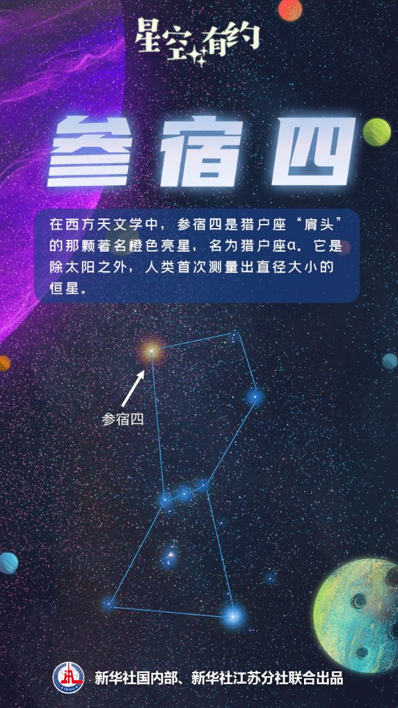 在西方天文學(xué)中,參宿四是獵戶座“肩頭”的那顆著名橙色亮星,名為獵戶座α。作為一顆紅超巨星,參宿四的半徑很大,約為太陽半徑的幾百倍。目前它已進(jìn)入“衰老”階段,是一顆“老年恒星”。它是除太陽之外,人類首次測量出直徑大小的恒星。
