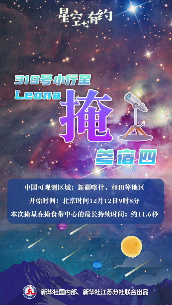 新華社南京12月10日電(記者邱冰清、秦華江)中國科學(xué)院紫金山天文臺科普主管王科超介紹,北京時間12月12日,319號小行星Leona將掩恒星參宿四。最早能看到本次掩星過程的是中國新疆喀什、和田等地區(qū),開始時間是當(dāng)日9時8分。本次掩星在掩食帶中心的最長持續(xù)時間約為11.6秒。