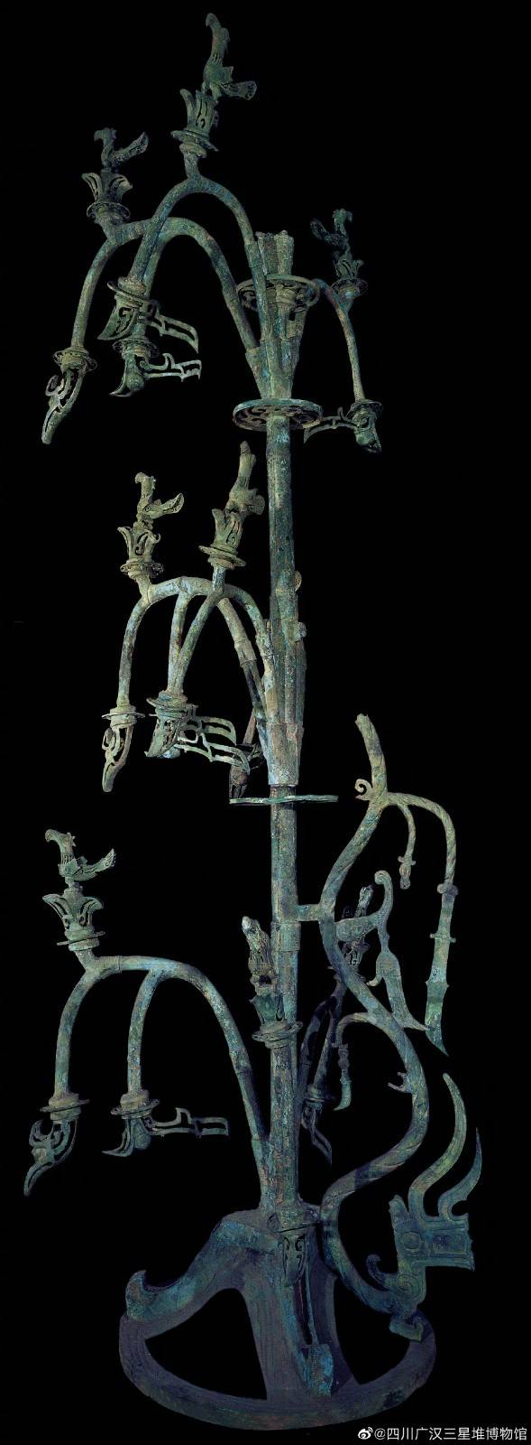 三星堆二號祭祀坑出土的青銅神樹。圖據(jù)三星堆博物館 兩坑出土的文物,完全顛覆了人們的認(rèn)知。四川盆地為群山包圍,“蜀道難,難于上青天”,蜀地與外界的交通被視為險途。但位于成都平原腹心地帶的三星堆竟然出土青銅尊、青銅罍、玉璋、玉戈、玉璧等中原殷商文化典型器物,顯示兩地超乎想象的文化聯(lián)系。另一方面,人們更加關(guān)注青銅大立人、縱目大面具、人頭像群、神樹以及黃金面具、金杖等,這類極具特色的器物組合群尚未見于中國乃至世界其他地區(qū)。