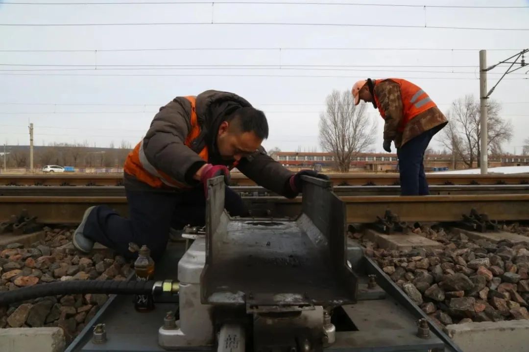 “放上木楔子,把道岔清理干凈!”為了保障春運(yùn)期間道岔平穩(wěn)運(yùn)行、列車安全暢通,鐵路信號(hào)工們加大道岔檢修力度,左手一把膩?zhàn)隅P、右手一瓶機(jī)油,為道岔進(jìn)行清潔保養(yǎng)。