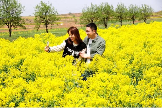 4月14日,在萬榮縣西村鄉(xiāng)望囑村的板藍根花地里游人在踏青賞花,親近自然。西村鄉(xiāng)到處都是板藍根花開放,競相爭艷,連成一片花?!?/p>