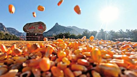 從空中俯瞰,景區(qū)標(biāo)志性的刻有“藏山”字樣的巨石,被連片的玉米“花海”環(huán)繞,綿延千米的道路上,玉米粒被村民們精心鋪成整齊的波紋狀,宛如一條流淌的金色長(zhǎng)河?!敖衲昃皡^(qū)把這么寬的路讓給我們晾曬糧食,真的解決了我們一大難題!”正在翻曬玉米的村民李師傅說(shuō)道。