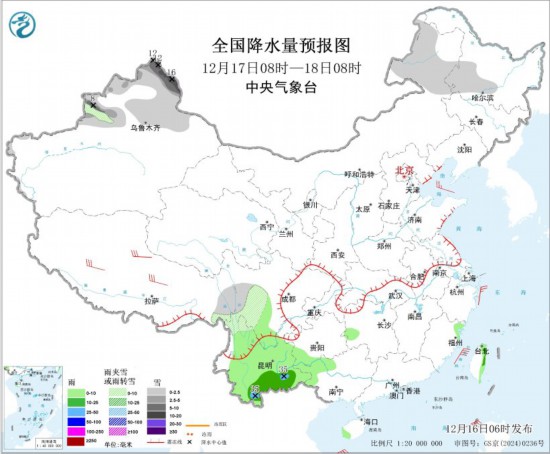 12月17日08時至18日08時,內蒙古東北部、黑龍江西南部、新疆北部、川西高原南部等地部分地區(qū)有小到中雪或雨夾雪,其中,新疆阿勒泰地區(qū)和伊犁河谷局地有大到暴雪(10~16毫米)。西南地區(qū)南部、湖南西部、福建東北部、廣西西北部、海南島西南部等地部分地區(qū)有小到中雨,其中,云南東南部局地有大雨(25~35毫米)。西藏中北部等地部分地區(qū)有4~6級風;東海南部海域、臺灣海峽、巴士海峽、南海東北部和中東部海域將有5~7級大風、陣風8級。