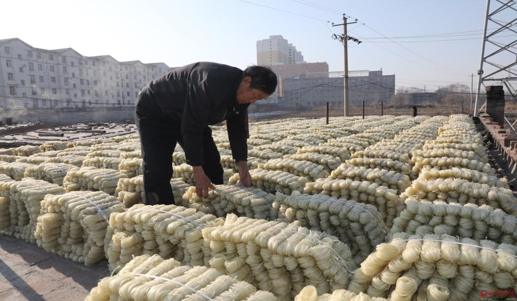 12月23日,原平市新原鄉(xiāng)班村老賈粉條加工廠內(nèi),老賈正在打捆制作好的粉條。老賈加工粉條已有30多個(gè)年頭,生產(chǎn)的傳統(tǒng)手藝無添加劑綠色粉條,很受市民青睞,不僅占領(lǐng)了本地市場(chǎng),還遠(yuǎn)銷大同、包頭,產(chǎn)品供不應(yīng)求。 (褚 震 攝)