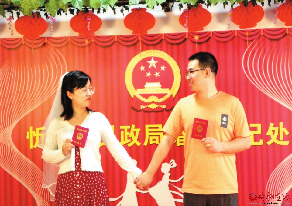 在頒證儀式上,登記員帶領(lǐng)新人宣讀結(jié)婚誓言。忻州市婦聯(lián)、市民政局相關(guān)領(lǐng)導為新人送上溫馨祝福。在忻府區(qū)民政局婚姻登記服務(wù)中心,新人們臉上洋溢著幸福的笑容,來到婚姻登記窗口依次辦理結(jié)婚手續(xù)。
