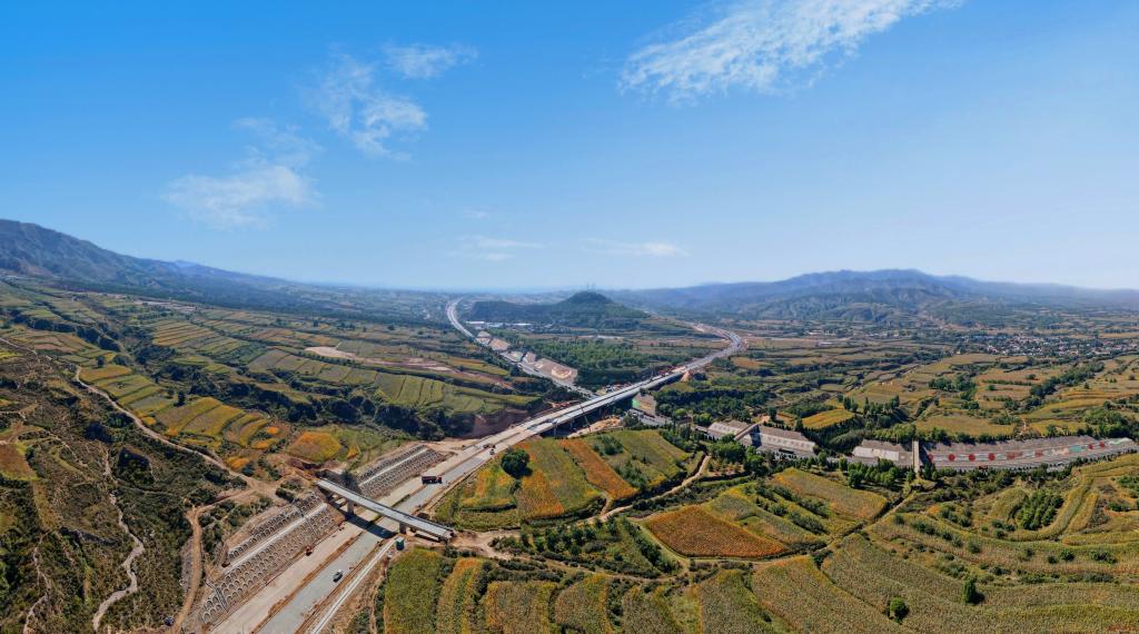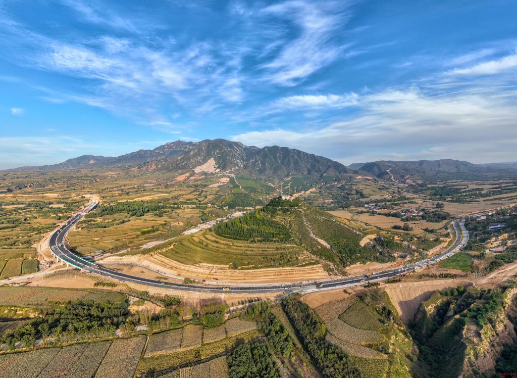 無人機升空,視野逐漸開闊,太忻大道如同巨龍穿行在大地之上,雄赳赳奔向遠方。
