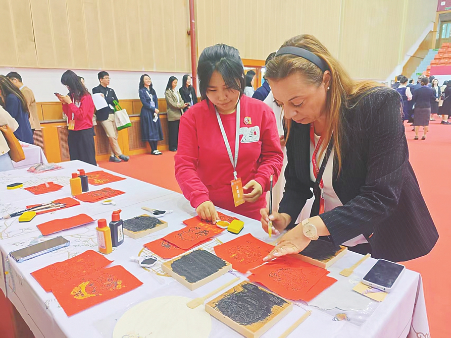 外國(guó)友人正在體驗(yàn)?zāi)景婺戤?huà)。本報(bào)記者張劍雯攝