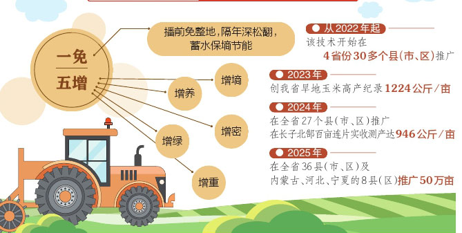 “一免五增”藝機(jī)一體化技術(shù)由山西農(nóng)大(省農(nóng)科院)有機(jī)旱作農(nóng)業(yè)研究院任志強(qiáng)科研團(tuán)隊(duì)實(shí)踐研發(fā)。其核心理念是通過農(nóng)藝農(nóng)機(jī)結(jié)合、良種良法配套,有效提高作物抗旱出苗、蓄水保墑和水肥利用率,秸稈自然腐熟,增強(qiáng)抗病性和抗倒性,從而通過增加密度助力單產(chǎn)提升,實(shí)現(xiàn)節(jié)本提質(zhì)增效和綠色可持續(xù)生產(chǎn)。該技術(shù)針對半干旱地區(qū)玉米生產(chǎn)中出苗難、秸稈還田成本高、機(jī)械作業(yè)成本高等問題,依托一體化農(nóng)機(jī)具實(shí)施保護(hù)性耕作,從而實(shí)現(xiàn)“一免五增”?!耙幻狻奔床デ懊庹兀裟晟钏煞?,蓄水保墑節(jié)能?!拔逶觥奔础霸鰤劇保瑴喜ヌ綁?,壟溝集雨,抗旱保苗;“增養(yǎng)”,秸稈歸壟腐熟,菌肥同播,培肥地力;“增密”,增株抗倒耐密,增加畝穗數(shù);“增綠”,測土分次施肥,增加穗粒數(shù),機(jī)械除草節(jié)肥藥;“增重”,一噴多促,延遲收獲增粒重。