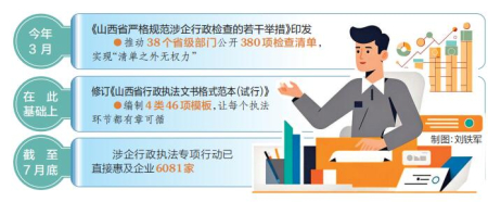 建立執(zhí)法清單,規(guī)范執(zhí)法行為。今年3月,省政府辦公廳印發(fā)《山西省嚴格規(guī)范涉企行政檢查的若干舉措》,推動38個省級部門公開380項檢查清單,實現(xiàn)“清單之外無權(quán)力”。同時,省司法廳推動各級行政執(zhí)法部門制定并公布年度行政檢查工作計劃,合理確定本單位對同一企業(yè)實施行政檢查的年度頻次上限,以及行政執(zhí)法部門的職責(zé)邊界。目前,已有21個省級行政檢查主體公布了行政檢查年度頻次上限,全省上半年涉企檢查總量同比下降36%。在此基礎(chǔ)上,修訂《山西省行政執(zhí)法文書格式范本(試行)》,編制4類46項模板,讓每個執(zhí)法環(huán)節(jié)都有章可循,進一步規(guī)范執(zhí)法行為。
