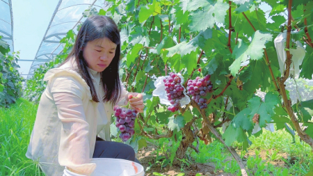 種植戶陳曉燕正在自家葡萄園摘葡萄。