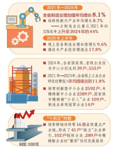 統(tǒng)計(jì)數(shù)據(jù)顯示,2021年—2024年,全省制造業(yè)增加值年均增長8.1%,戰(zhàn)略性新興產(chǎn)業(yè)年均增長8.7%,占制造業(yè)比重從2021年的32%逐年上升至2024年的44%。2025年上半年全省規(guī)上裝備制造業(yè)增加值增長9.6%,高技術(shù)產(chǎn)業(yè)投資增速達(dá)17.8%,戰(zhàn)略性新興產(chǎn)業(yè)對工業(yè)增長貢獻(xiàn)率日漸提高。