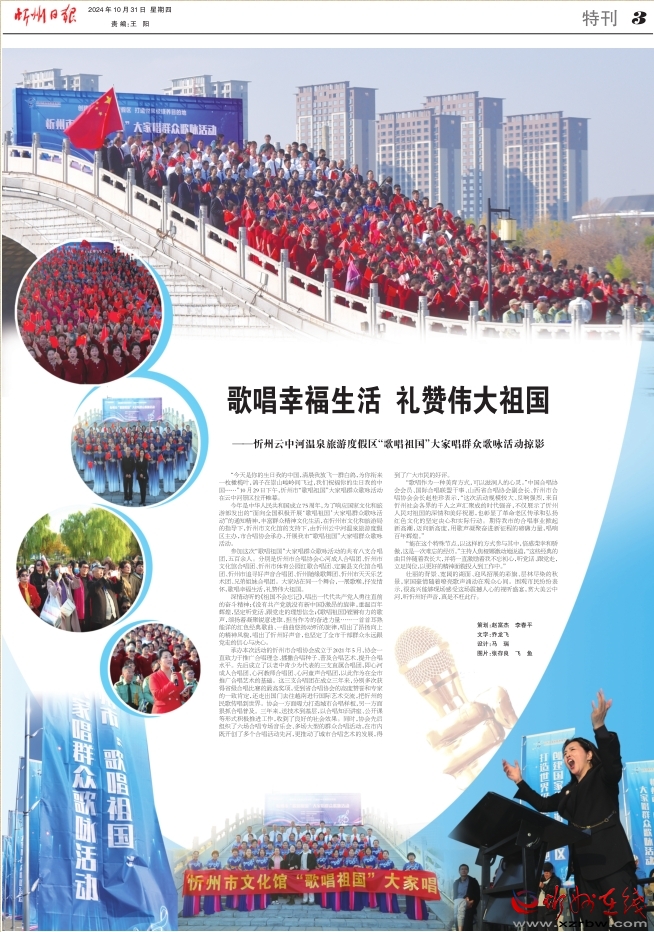 今年是中華人民共和國成立75周年,為了響應(yīng)國家文化和旅游部發(fā)出的“面向全國積極開展‘歌唱祖國’大家唱群眾歌詠活動”的通知精神,豐富群眾精神文化生活,在忻州市文化和旅游局的指導(dǎo)下,忻州市文化館的支持下,由忻州云中河溫泉旅游度假區(qū)主辦,市合唱協(xié)會承辦,開展我市“歌唱祖國”大家唱群眾歌詠活動。