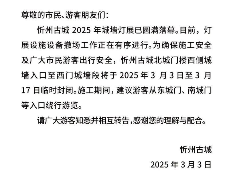 忻州古城:暫停開放公告!