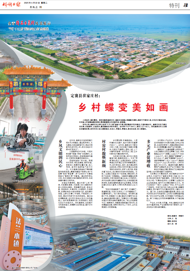 崔家莊村工業(yè)基礎(chǔ)雄厚,自然形成了以法蘭鍛造為主的企業(yè)聚集工業(yè)區(qū),共有鍛造企業(yè)50戶,規(guī)模以上企業(yè)21戶,機(jī)加工企業(yè)67戶。其中,國家級“專精特新”小巨人企業(yè)1戶,省級“專精特新”企業(yè)8戶,省級專精特新“小巨人”企業(yè)4戶,高新技術(shù)企業(yè)4戶,從業(yè)人員2300余人,人均可支配收入約2.8萬元。通過技術(shù)創(chuàng)新、集群發(fā)展和產(chǎn)業(yè)鏈延伸,法蘭產(chǎn)業(yè)不僅解決了崔家莊村的就業(yè)問題,更帶動了區(qū)域經(jīng)濟(jì)轉(zhuǎn)型升級,為鄉(xiāng)村振興提供了實踐樣本。