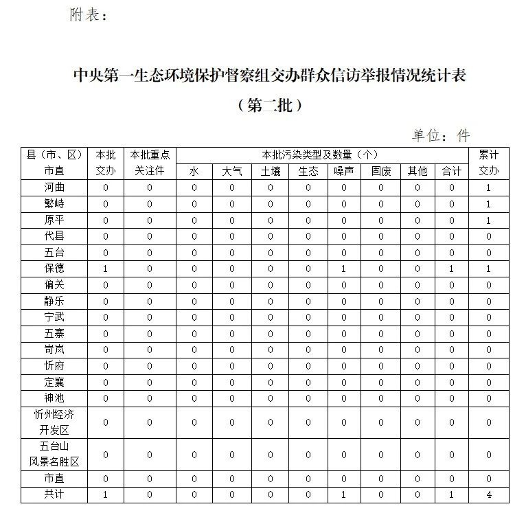 截至5月30日,中央第一生態(tài)環(huán)境保護(hù)督察組累計(jì)向我市交辦信訪(fǎng)件4件,其中重點(diǎn)關(guān)注件0件。交辦的信訪(fǎng)件中,涉及原平市1件、河曲縣1件、繁峙縣1件、保德縣1件;涉及生態(tài)環(huán)境問(wèn)題4個(gè),其中水污染問(wèn)題1個(gè)、大氣污染問(wèn)題1個(gè)、生態(tài)破壞問(wèn)題1個(gè)、噪聲污染問(wèn)題1個(gè)。