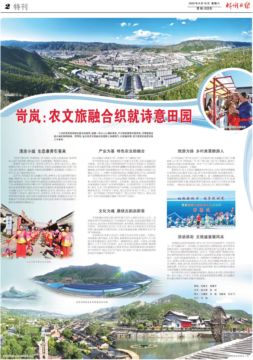 八月的岢嵐逐漸褪去夏日的燥熱,獨(dú)留一份沁人心脾的清涼,不少游客循著涼意而來(lái),盡情感受這座小城的獨(dú)特韻味。而岢嵐,也正在農(nóng)文旅融合的道路上加速前行,以底蘊(yùn)深厚、活力迸發(fā)的姿態(tài)迎接八方來(lái)客。 清涼小城 生態(tài)康養(yǎng)引客來(lái) “岢嵐氣候涼爽、環(huán)境舒適、空氣極好,岢嵐人厚道包容、極易相處,生活氣息濃厚,特別適合老年人消夏避暑。”陳景玲大姐說(shuō)。 陳景玲大姐今年75歲,老伴劉大哥76歲,老兩口是北京人,他們經(jīng)朋友介紹,今年6月下旬來(lái)到岢嵐,目前已在縣城福樂(lè)園小區(qū)租了房子??;每天看看書、遛遛街,和街坊鄰居聊聊天,很是愜意,計(jì)劃住上三四個(gè)月,過(guò)了國(guó)慶再回北京。 近年來(lái),岢嵐縣以農(nóng)文旅融合為筆,深耕本土農(nóng)文旅資源內(nèi)涵與潛量,圍繞“吃、住、行、游、購(gòu)、娛”全鏈條精心布局,穩(wěn)步推進(jìn)以宋家溝國(guó)家4A級(jí)景區(qū)、岢嵐古城和宋長(zhǎng)城國(guó)家3A級(jí)旅游景區(qū)為代表的文旅產(chǎn)業(yè);積極推進(jìn)宋家溝沙棘文化產(chǎn)業(yè)園國(guó)家3A級(jí)旅游景區(qū)、吳家莊省級(jí)生態(tài)旅游度假區(qū)建設(shè);加快實(shí)施宋長(zhǎng)城景區(qū)索道及配套設(shè)施項(xiàng)目;主動(dòng)融入全市“大蘆芽山”開(kāi)發(fā),擦亮紅色文化、綠水青山、航天產(chǎn)業(yè)“紅綠藍(lán)”三色名片,將紅色文化、自然風(fēng)光、歷史文化、鄉(xiāng)村民俗、航天科技等結(jié)合起來(lái),逐步完善文旅康養(yǎng)體系和線路,積極推動(dòng)文創(chuàng)產(chǎn)業(yè)和康養(yǎng)產(chǎn)業(yè)發(fā)展;加快推進(jìn)城南巷子活化運(yùn)營(yíng),探索鄉(xiāng)村旅游新模式,激發(fā)全域旅游發(fā)展新活力。 產(chǎn)業(yè)為基 特色農(nóng)業(yè)助融合 農(nóng)文旅融合,根基在“農(nóng)”,靈魂在“文”,通路在“旅”。 作為傳統(tǒng)農(nóng)業(yè)縣,岢嵐始終以產(chǎn)業(yè)振興為引擎,為農(nóng)文旅融合筑牢根基。這片黃土地上孕育的特色物產(chǎn)已成為打開(kāi)致富之門的密碼:高家會(huì)鄉(xiāng)的毛建茶帶著山野清香,麒麟西瓜甜透田間地頭,富硒蔬菜鮮嫩欲滴,還有榮獲“國(guó)家地理標(biāo)志產(chǎn)品”的紅蕓豆,年銷量占全國(guó)出口總量近三分之一。沙棘產(chǎn)業(yè)更延伸出飲品、保健品等多元產(chǎn)品,這些特色農(nóng)產(chǎn)品頻頻亮相省內(nèi)外大平臺(tái),從田間地頭走向更廣闊的市場(chǎng)。 不止于此,岢嵐致力于讓農(nóng)業(yè)掙脫“面朝黃土背朝天”的傳統(tǒng)印象,向現(xiàn)代化復(fù)合型產(chǎn)業(yè)轉(zhuǎn)型。尤其值得一提的是,岢嵐縣將智慧農(nóng)業(yè)基地建設(shè)與旅游產(chǎn)業(yè)發(fā)展深度融合,立足資源優(yōu)勢(shì),大力發(fā)展西紅柿、南瓜、木耳、羊肚菌等特色農(nóng)產(chǎn)品種植,并在旅游旺季推出各類采摘體驗(yàn)活動(dòng),不僅吸引了游客,更讓村民們?cè)诩议T口吃上了“旅游飯”。這不僅鼓起了農(nóng)民的“錢袋子”,更讓鄉(xiāng)村有了吸引人、留住人的底氣,為農(nóng)文旅深度融合鋪就了堅(jiān)實(shí)的產(chǎn)業(yè)基石。 文化為魂 賡續(xù)古韻啟新章 岢嵐的融合發(fā)展之路,始終扎根于這片土地的文化沃土之中。這里既有荷葉坪的林海茫茫、宋長(zhǎng)城的歲月滄桑,也有抗戰(zhàn)時(shí)期留下的紅色印記、航天事業(yè)孕育的科技情懷,更有剪紙、刺繡等民俗文化的代代相傳。岢嵐深挖紅色文化、歷史文化、航天文化和民俗文化等優(yōu)質(zhì)資源,通過(guò)創(chuàng)新文化服務(wù)供給、完善文旅基礎(chǔ)設(shè)施,將散落的文化“珍珠”串聯(lián)成線。 在縣域內(nèi)許多重大活動(dòng)中,非遺文化成為岢嵐文旅的一大特色:傳統(tǒng)版畫、葫蘆烙畫、木刻、剪紙、刺繡等作品紛紛登場(chǎng)“走秀”;不少游客走進(jìn)非遺體驗(yàn)區(qū),或親手剪上一幅剪紙作品,或繡一只荷包,找尋蘊(yùn)藏在小小手工中的文化密碼。此外,各大景區(qū)還推出書畫展、壁畫展等,非遺與旅游的深度融合讓剪紙的靈動(dòng)、刺繡的精美成為游客眼中的“岢嵐符號(hào)”,既讓文化“活”起來(lái),也讓旅游“火”起來(lái),構(gòu)建起獨(dú)具特色的農(nóng)文旅融合“岢嵐樣本”。 旅游為脈 鄉(xiāng)村美景醉游人 從“田間地頭”到“詩(shī)與遠(yuǎn)方”,鄉(xiāng)村旅游為農(nóng)文旅融合打通了關(guān)鍵脈絡(luò),讓“農(nóng)”有了附加值,“文”有了展示窗,“旅”有了落腳點(diǎn),最終匯成推動(dòng)鄉(xiāng)村振興的澎湃動(dòng)能。作為“千萬(wàn)工程”示范樣本的王家岔村,便是岢嵐鄉(xiāng)村旅游的一個(gè)縮影。 夏秋時(shí)節(jié),走入王家岔,潺潺溪水穿村而過(guò),古色古香的村落鑲嵌在蔥蘢的山間;漫步鄉(xiāng)間小道,青山綠水相映成景,新老建筑渾然一體,處處皆景,處處怡情,盡顯鄉(xiāng)村魅力。登一段蜿蜒曲折的宋長(zhǎng)城,撫摸厚重而光滑的片石,感受歷經(jīng)滄桑而屹立不倒的風(fēng)云歲月;走進(jìn)生機(jī)勃勃的果樹(shù)大棚,清新的果香撲鼻而來(lái),游客可以盡情享受采摘的喜悅。一路走來(lái),既是紅色之旅,又是生態(tài)之行,更是文化溯源。 活動(dòng)添彩 文旅盛宴展風