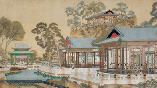 畫面中,曲折縈紆的溪水自蘅蕪院流經(jīng)牡丹亭、凹晶館、蓼風(fēng)軒、秋爽齋等地,最終蜿蜒向畫面遠方,層層亭臺廊橋,一望無盡。許軍杰認為,此繪之溪水應(yīng)為沁芳溪。正如周汝昌先生在《北京大觀園·引言》中評價:“大觀園全部的主脈與‘靈魂’是一條蜿若游龍的‘沁芳溪’。亭、橋、泉、閘,皆以此二字為名,可為明證。一切景觀,依溪為境”,“大觀園的一切池、臺、館、泉、石、林、塘,皆以沁芳溪為大脈絡(luò)而盤旋布置?!眻D中的這曲溪水亦有異曲同工之功能,將兩岸建筑、山石、樹木巧妙地聯(lián)系在一起,使其形成一個有機的園林整體。(李君娜)