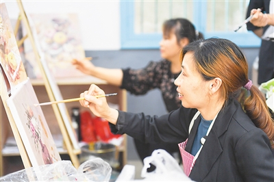 近年來,湖南省瀏陽市小河鄉(xiāng)引進(jìn)農(nóng)民畫室產(chǎn)業(yè),讓農(nóng)民可以在家務(wù)農(nóng)時(shí)利用空余時(shí)間務(wù)工。小河鄉(xiāng)現(xiàn)有460余名農(nóng)民畫師,累計(jì)帶動(dòng)50余名貧困戶參與。圖為小河鄉(xiāng)烏石村村民在繪制油畫。