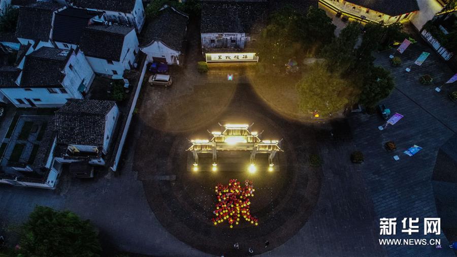 9月29日,龍門(mén)鎮(zhèn)文明志愿幫幫團(tuán)的志愿者提著花燈排成一個(gè)“家”字,慶祝古鎮(zhèn)廟會(huì)開(kāi)啟(無(wú)人機(jī)照片)。新華社記者 徐昱 攝
