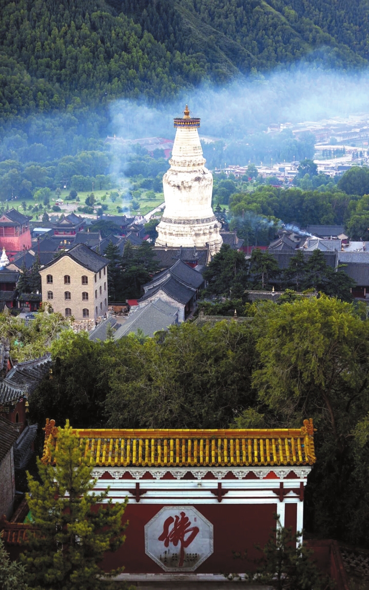 1948年春,毛澤東率領(lǐng)中央機(jī)關(guān)經(jīng)岢嵐、五寨、神池、代縣、繁峙,抵達(dá)五臺(tái)山臺(tái)懷鎮(zhèn),路居于塔院寺方丈院。彼時(shí),雪后初晴,碧空萬里,五臺(tái)山佛教圣地沐浴在朝暉之中,顯得格外光彩奪目,典雅壯觀。在地方干部和老方丈陪同下,他們游覽了塔院寺的大慈延壽寶殿、大藏經(jīng)閣。從塔院寺出來,毛澤東等中央領(lǐng)導(dǎo)與陪同人員邊談邊走進(jìn)羅睺寺,興致勃勃地觀看了“開花現(xiàn)佛”,還詳細(xì)詢問了寺院的修繕工作和寺僧的生活情況,指示陪同的地方干部要抓緊寺院的修復(fù)和保護(hù)工作。離開羅睺寺,他們又進(jìn)入顯通寺參觀無量殿和銅殿,之后向鐘樓走去。樓內(nèi)懸掛著一口比人還高的大銅鐘,眾人品讀著鐘上鑄刻的經(jīng)文,不時(shí)向老方丈請(qǐng)教。
