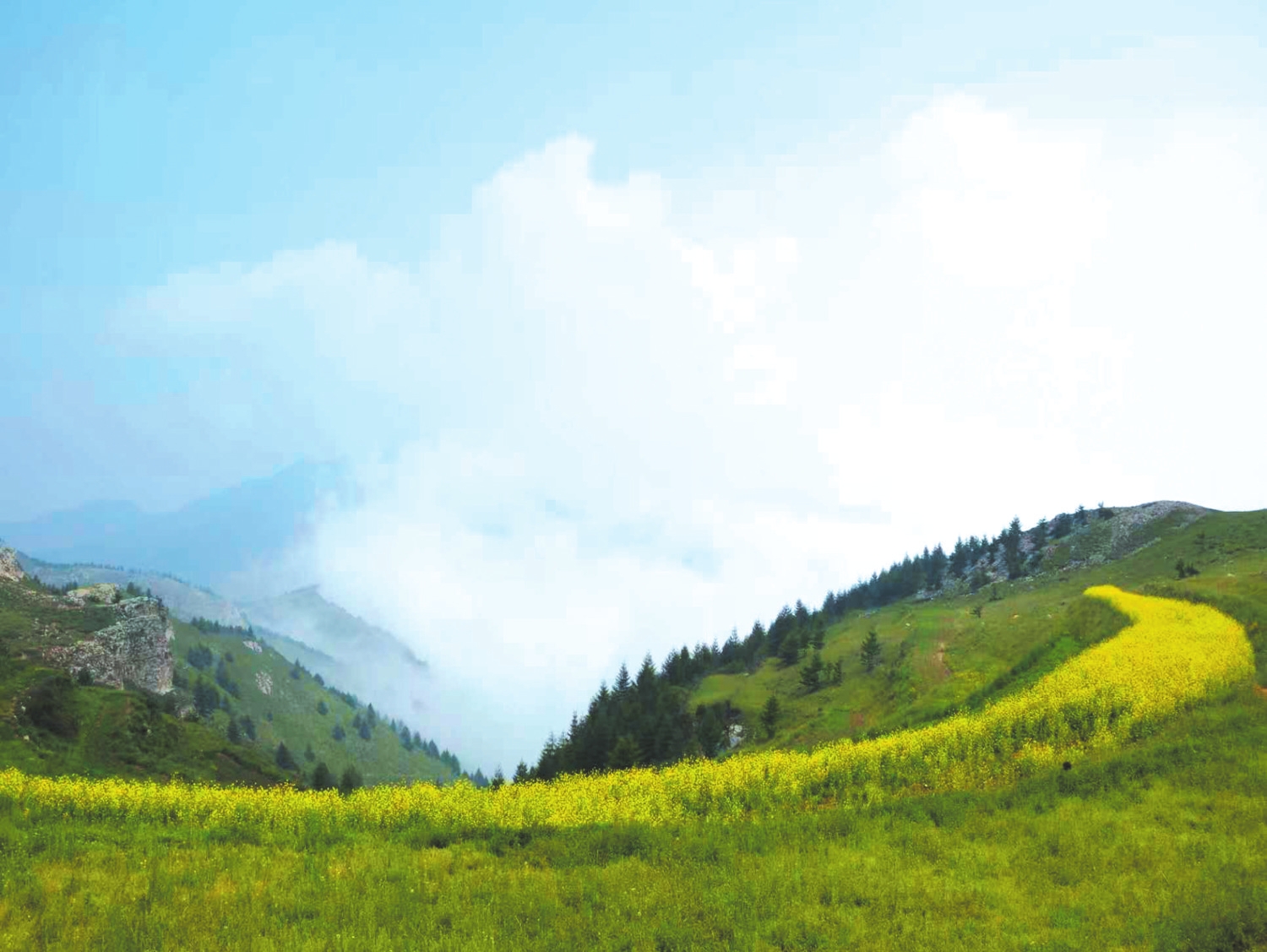 站立在山崖邊,面對萬頃云海,清爽的高山氣息在肌膚上輕輕拂過,從山下帶上來的那種燥熱漸漸消退,有人禁不住放開喉嚨高聲吶喊:“哎——” 環(huán)繞著小山村四周,有數(shù)塊油菜花肆意開放,黃燦燦的色調(diào)在山頂上特別醒目,與峰巒上的青草綠樹形成強烈對比,相映成景。 老君洞山峰的凸起點位居四山中央,奇險峻極奪人眼球,與不遠(yuǎn)處海拔2364米的水背尖遙遙相對,山西電視臺的1125差轉(zhuǎn)臺就建在上面。山中的云霧像一條白色綢帶纏繞在兩座山巒自然形成的溝壑間,為水背尖與老君洞增添了一種難以看穿的神秘色彩。 山坡上,遍地開放著各種各樣的山花,燦若星空。聽山里長大的人介紹,純黃色花瓣的叫雞蛋黃黃花,狼毒花也叫取燈頭頭花,蘭花花可制茶。數(shù)數(shù)看,可以采摘食用的微型山果有刺梨、地香香、沙窩窩、毛榛子等,當(dāng)然更多的是不知名或叫不來的,大山里的豐盛不是山外人可以想象的。 村子前面有一片油菜花,地塊隨山形而走,有長沒寬,只彎不直,恰似一個懶散人不守規(guī)矩信手涂畫的U形圈,在高處遠(yuǎn)望時卻像一條飄逸的黃絲帶。 黑水圪妥村街道冷清,少有行人來往。一處低洼的院子里開出了紅艷艷的花,也許只有在這里才能開得如此驚艷。村外,羊群在草地上悠閑地吃草,與白云相映襯,形成一幅自然的田園風(fēng)光。 有資料介紹,2009年時,黑水圪妥村有116戶、405人,其中勞力176個??裳巯?,村里常住的已經(jīng)沒幾戶人了,在大山架里,愈顯人煙稀少。 一條小巷的盡頭,街門洞里,坐著一位老嫗,看見有游人走來,便開口問:“要茶葉呀不?”因為年老嘴癟,說話不太清楚,連續(xù)問了數(shù)聲,游人才聽清。這大山上生長著一種植物,橢圓形葉子,淺藍(lán)色花朵,經(jīng)過摘、洗、蒸、藏、晾等多道工序,便成為山茶,可清熱、下火、解暑、開胃、通便、排毒等。于是,大家爭著解囊,用200元買下老人半蛇皮袋自制香茶。老人問:“要六道木拐棍嗎?爬山拄?!庇腥烁先诉M(jìn)院子里看,一間老舊的房屋里,果然放著一堆用六道木制作的拐棍,去皮粗加工,談不上精致。幾個人都各自挑選了一根,每人付款10元。