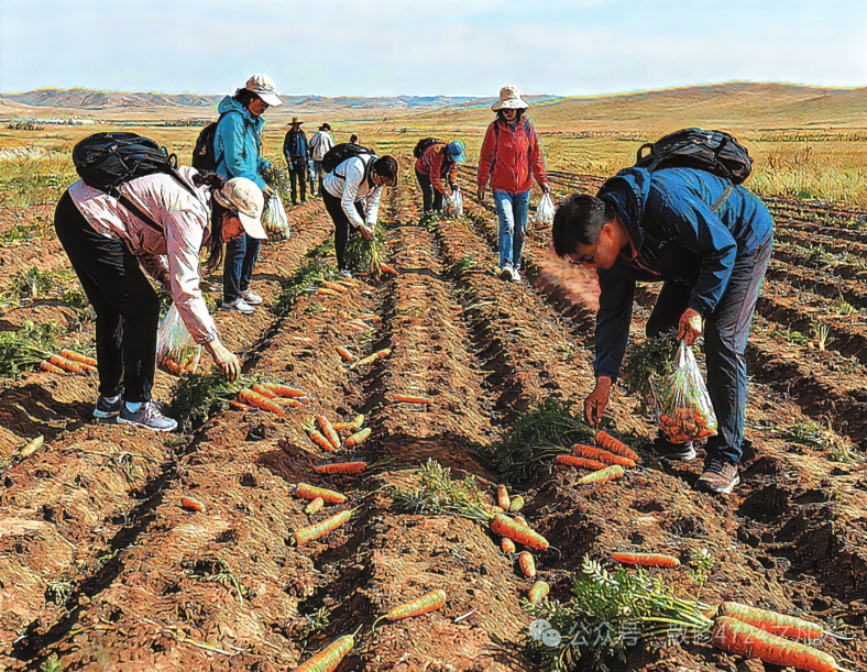 “撿秋”游演繹著“鄉(xiāng)土中國”的現(xiàn)代篇章。費孝通在《鄉(xiāng)土中國》開篇即言“從基層上看去,中國社會是鄉(xiāng)土性的”。這種“鄉(xiāng)土性”的核心是人與土地的深度綁定。農(nóng)民靠土地生存,土地是文化認同的根基。“撿秋”這種農(nóng)耕活動,如今以更加鮮活方式延續(xù)下來。對農(nóng)民而言,土地不僅是謀生手段,更是安身立命的“精神原鄉(xiāng)”。而城市游客的參與則賦予了“撿秋”新的意義。在城市里待久了,就想蹲在田里感受泥土的溫度,游客“撿秋”體驗的是“春種秋收”踏實感。這種體驗式參與是現(xiàn)代人對鄉(xiāng)土文明的“情感反哺”。游客們彎腰的身影既是對土地的致敬,也是對“根”的追尋。他們未必真懂農(nóng)事,但通過參與“撿秋”完成了對鄉(xiāng)土文化的認同,被撿起的“果實”從“生存作物”演變?yōu)椤拔幕浇椤薄.斍?,?nèi)蒙古各地推出的挖土豆、烤土豆等旅游項目是對鄉(xiāng)土資源的文化再“編碼”,當土豆從田間走向游客的后備箱,“鄉(xiāng)土中國”便獲得了更加豐富的表達。