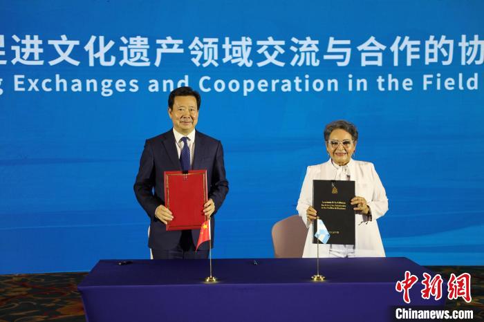 亞洲文化遺產(chǎn)保護聯(lián)盟理事會主席、國家文物局局長李群(左)與洪都拉斯文化、遺產(chǎn)和藝術(shù)部部長貝萊斯簽署關(guān)于促進文化遺產(chǎn)領(lǐng)域交流與合作的協(xié)議。國家文物局供圖