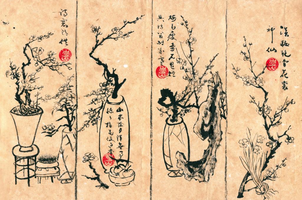 明代文震亨在其《長(zhǎng)物志》中有一段評(píng)述梅的文字:“幽人花伴,梅實(shí)專房。取苔護(hù)蘚封,枝稍古者,移植石巖或庭際,最古。另種數(shù)畝,花時(shí)坐臥其中,令神骨俱清,綠蕚更勝,紅梅差俗;更有虬枝屈曲,置盆盎中者,極竒。蠟梅磬口為上,荷花次之,九英最下,寒月庭際,亦不可無(wú)?!?/p>