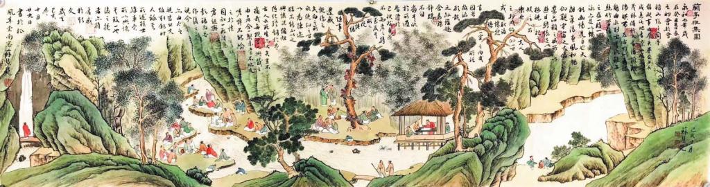 東晉永和九年(353年)上巳節(jié),會稽內(nèi)史王羲之和謝安、孫綽等人在山陰蘭亭修禊,曲水流觴,飲酒賦詩,所作詩歌后來結集為《蘭亭集》,王羲之為之撰序,即被稱作“天下第一行書”的《蘭亭序》,而蘭亭雅集的詩酒風流也成為千古佳話。在后世仿效的各類蘭亭雅集中,詩歌、繪畫、書法等多種藝術元素爭奇斗艷,形成華麗精致、傳承千載的文化景觀。