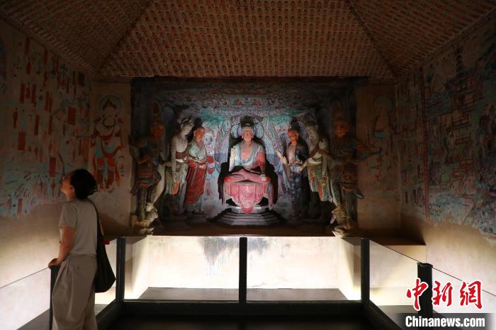 6月18日,游客在重慶中國三峽博物館參觀“從敦煌到大足——石窟藝術(shù)中國化流變展”。梁欽卿 攝 展覽搭建“北敦煌·南大足”對話舞臺,以“原跡重現(xiàn)+當(dāng)代詮釋”模式,帶領(lǐng)觀眾感受兩大遺產(chǎn)跨越時空的藝術(shù)共鳴。 通過數(shù)字孿生技術(shù),展覽整窟復(fù)制敦煌莫高窟第158窟、第3窟、第45窟、第17窟和大足石刻寶頂山小佛灣第9號毗盧庵、大足石刻北山第245號窟,打破不可移動文物的地理局限性,兼顧文物保護(hù)與傳播。 展覽深化數(shù)字技術(shù)應(yīng)用,打造沉浸式體驗(yàn)空間,以現(xiàn)代化展陳語言對石窟藝術(shù)中國化歷程創(chuàng)新詮釋。借助AI技術(shù)與交互科技,游客通過“點(diǎn)亮千手觀音”光影互動裝置,與電子屏合掌時就能夠?qū)崟r生成圖像,助力觀音貼金,體驗(yàn)千手觀音“修復(fù)”工作,打破傳統(tǒng)展陳時空界限,深度參與文物體驗(yàn)。