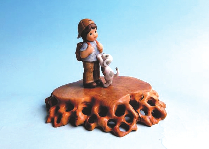 我的藏品中有一件來自德國的喜姆瓷偶·上學(xué),它是赴德工作的同事帶回的禮物。這件瓷偶高8.5厘米、長5.5厘米、寬2.8厘米,生動刻畫了一個背著雙肩包即將去學(xué)校的小男孩和一只不舍小主人離開的花狗,溫馨逗趣的畫面讓人忍俊不禁。