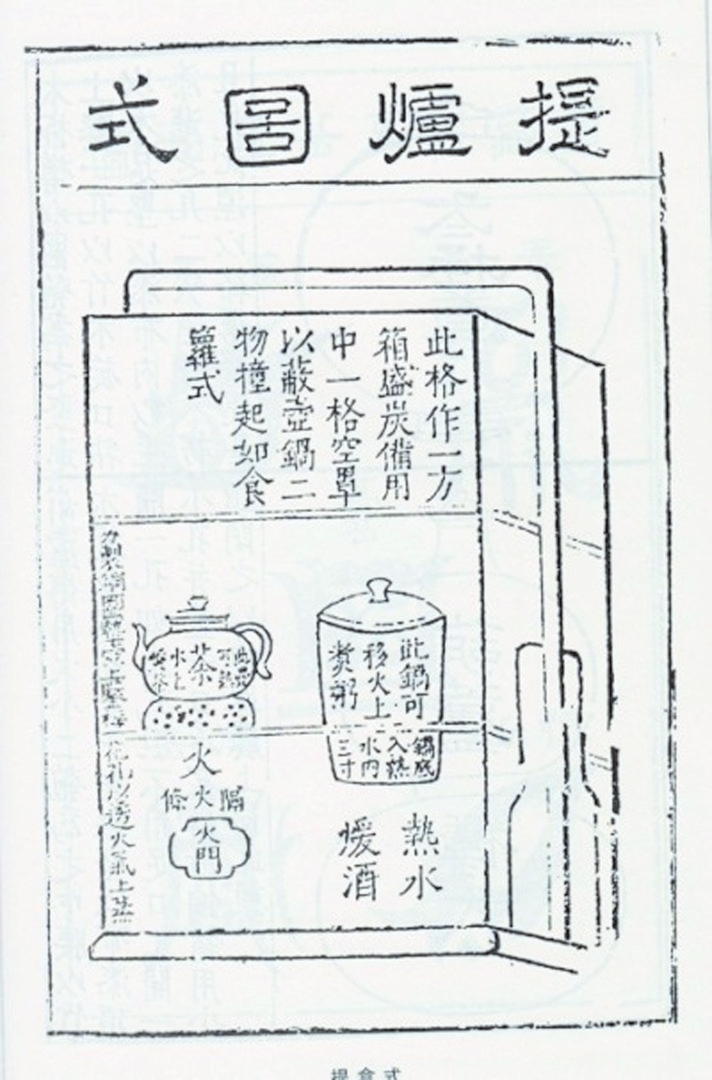 根據(jù)文字與插圖可以看出,提爐的靈感來自當(dāng)時普遍使用的“三撞”,即三層式提盒,由可以靈活組裝或分卸的幾部分組成,包括一個帶有底座的提梁架、兩層方屜盒、一個四方形圍框,以及一只銅質(zhì)四方形的水火爐。兩層屜盒與四方形圍框在外徑上尺寸一致,且彼此采用子母口套合,可以按照一層屜盒在下、四方形圍框在中、一層屜盒在上的形式疊置,并依靠子母口嵌合牢固。下層方屜盒的外徑尺寸要與提梁架底座上的淺凹槽正好相當(dāng),這樣在移動過程中,屜盒就能牢固嵌置在底座的凹槽內(nèi),不會脫落。整套配置中最重要的組件是一只小銅火爐,這只銅爐亦為四方形,外徑與下層屜盒的內(nèi)徑相當(dāng),可以恰好放置在屜內(nèi),不會晃動。此爐之所以名為“水火爐”,是因為爐體的內(nèi)部用銅板隔為左右兩個用途不同的區(qū)域,分別發(fā)揮煮水風(fēng)爐與燙酒器的功能。左半部的頂面安有圓形灶,可以放入火炭,在其側(cè)壁上則開有火門,用以通風(fēng)、清灰,因此只要將特制的茶壺置于灶上,就可以隨時生火煮水,沖茶品茗;右半部則僅在頂面開有一個圓口,使用的時候通過圓口向內(nèi)注入熱水,然后把一只與圓口大小相配的帶蓋小桶放入其中,再把酒注入小桶,將酒燙熱。小桶是為了組合方便精心設(shè)計的,還可以擔(dān)任袖珍煮鍋的角色,故《遵生八箋》中稱其為“小鑊”。游玩中肚子餓時,還可以隨時把這只小桶放到灶口上,煮粥或者其他便于快速制作的飲食,就地來一頓野餐。