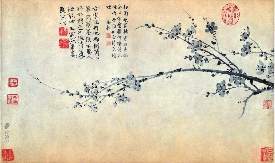 王冕《墨梅圖》是元代梅花題材繪畫的代表作,既展現(xiàn)了文人的傲然風(fēng)骨,亦革新了北宋以來的梅花筆法。與眾多畫家筆下的“官梅”相比,王冕更喜愛以“野梅”入題,這或許因?yàn)椤耙懊贰钡娘L(fēng)骨更為突出,也更能寄托畫家對(duì)自由的追逐。王冕筆下的墨梅擺脫了枯燥外形與彎曲枝蔓的束縛,彰顯不凡的氣度與精神。清人朱方靄在《畫梅題記》中說:“宋人畫梅,大都疏枝淺蕊,至元煮石山農(nóng)(王冕的號(hào))始易以繁花,千叢萬簇,倍覺豐神綽約,珠胎隱現(xiàn),為此花別開生面。”