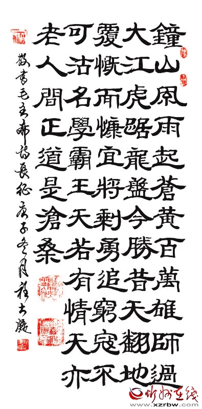 二是程老有真功。他一人能熟練書寫甲骨、篆書、魏碑、曹全隸、乙瑛隸、章草、歐柳楷、顏趙楷、行楷、行書、行草、草書、伊秉綬隸、創(chuàng)新粗圓、創(chuàng)新仿宋、創(chuàng)新大黑、創(chuàng)新角篆、仿毛體18種書體(見圖)。還會畫畫寫詩,詩書畫樣樣精通。對程大凝而言,臨帖是他最大的快樂,創(chuàng)作是他最大的滿足。現(xiàn)在他的工作室有4000多幅作品。退休后參加全國性書法大賽就獲獎300余次。