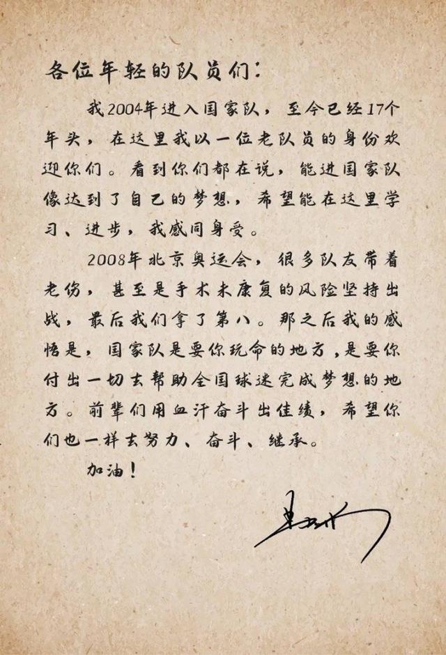 易建聯(lián)在信中回顧了自己首次入選國家隊(duì)的感受,表示自己完全能理解新隊(duì)員此刻的心情,他尤其強(qiáng)調(diào)了榮譽(yù)感與責(zé)任感,對這些小兄弟們說“國家隊(duì)是要你玩命的地方”,“各位年輕隊(duì)員們,我2004年進(jìn)入國家隊(duì),至今已經(jīng)有17個年頭,在這里我以一位老隊(duì)員的身份歡迎你們??吹侥銈兌荚谡f,能進(jìn)國家隊(duì)像達(dá)到了自己的夢想,希望能在這里學(xué)習(xí)、進(jìn)步,我感同身受。2008年北京奧運(yùn)會,很多隊(duì)友帶著老傷,甚至是手術(shù)未康復(fù)的風(fēng)險堅(jiān)持出戰(zhàn),最后我們拿到了第八。那之后我的感悟是,國家隊(duì)是要你玩命的地方,是要你付出一切去幫助全國球迷完成夢想的地方。前輩們用血汗奮斗出佳績,希望你們也一樣去努力、奮斗、繼承?!?/span>