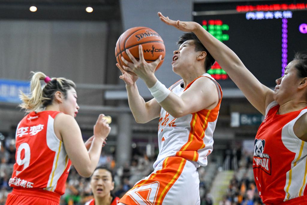 4月11日,內(nèi)蒙古隊(duì)球員李緣(中)在比賽中上籃。新華社記者 連振 攝 這是內(nèi)蒙古隊(duì)與四川隊(duì)第三次在WCBA總決賽相遇,兩隊(duì)此前互有勝負(fù)。2021-2022賽季,內(nèi)蒙古隊(duì)擊敗四川隊(duì)捧起總冠軍獎(jiǎng)杯;2022-2023賽季的總冠軍則被四川隊(duì)收入囊中。 比賽的前三節(jié),以防守見(jiàn)長(zhǎng)的內(nèi)蒙古隊(duì)充分發(fā)揮優(yōu)勢(shì),抑制了四川隊(duì)幾個(gè)關(guān)鍵得分點(diǎn)的發(fā)揮,四川隊(duì)李夢(mèng)在上半場(chǎng)一分未得。