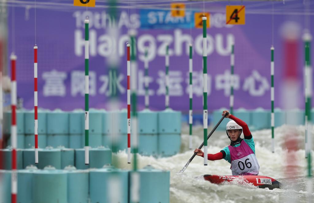 2023年10月7日,杭州亞運(yùn)會(huì)皮劃艇激流回旋項(xiàng)目女子單人劃艇決賽在杭州富陽(yáng)水上運(yùn)動(dòng)中心舉行,圖為中國(guó)選手黃娟在比賽中獲得冠軍。新華社記者 杜瀟逸 攝
