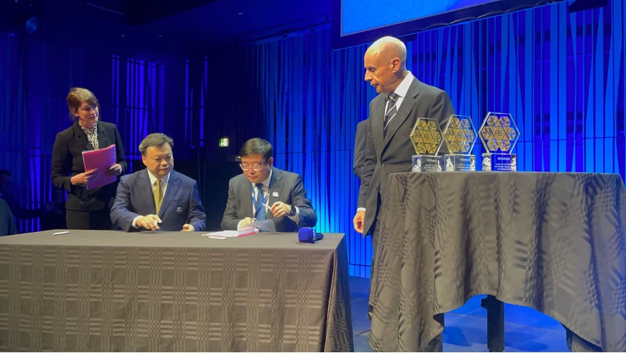 會上,國際雪聯(lián)主席約翰·埃利亞施、秘書長米歇爾·韋恩與國家體育總局冬季運動管理中心主任王磊、張家口市人民政府副市長劉海峰簽訂了辦賽協(xié)議。埃利亞施向張家口市頒發(fā)2029年國際雪聯(lián)單板滑雪和自由式滑雪世錦賽舉辦城市牌匾,王磊、河北省體育局局長王彪、劉海峰共同接牌。