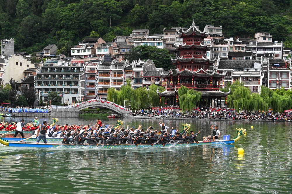 6月10日,參賽隊伍在貴州省鎮(zhèn)遠縣?陽河上進行龍舟比賽。新華社記者 楊文斌 攝
