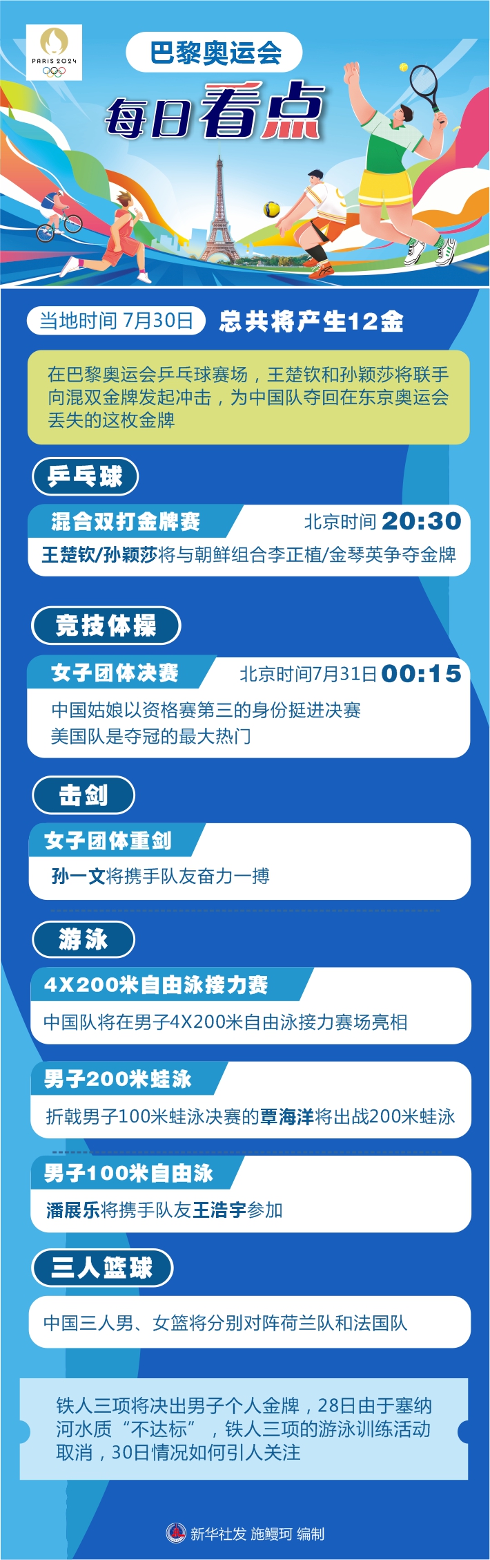 還有一些項(xiàng)目將拉開戰(zhàn)幕。中國(guó)三人男、女籃將分別對(duì)陣荷蘭隊(duì)和法國(guó)隊(duì)。鐵人三項(xiàng)將決出男子個(gè)人金牌,28日由于塞納河水質(zhì)“不達(dá)標(biāo)”,鐵人三項(xiàng)的游泳訓(xùn)練活動(dòng)取消,30日情況如何引人關(guān)注。