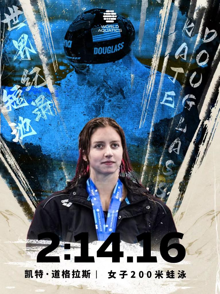 美國(guó)的奧運(yùn)冠軍道格拉斯在女子200米蛙泳決賽中以2分14秒16打破短池世界紀(jì)錄并奪冠,她還在100米混合泳決賽中技?jí)喝悍紛Z魁,繼續(xù)領(lǐng)跑世界杯女選手積分榜。
