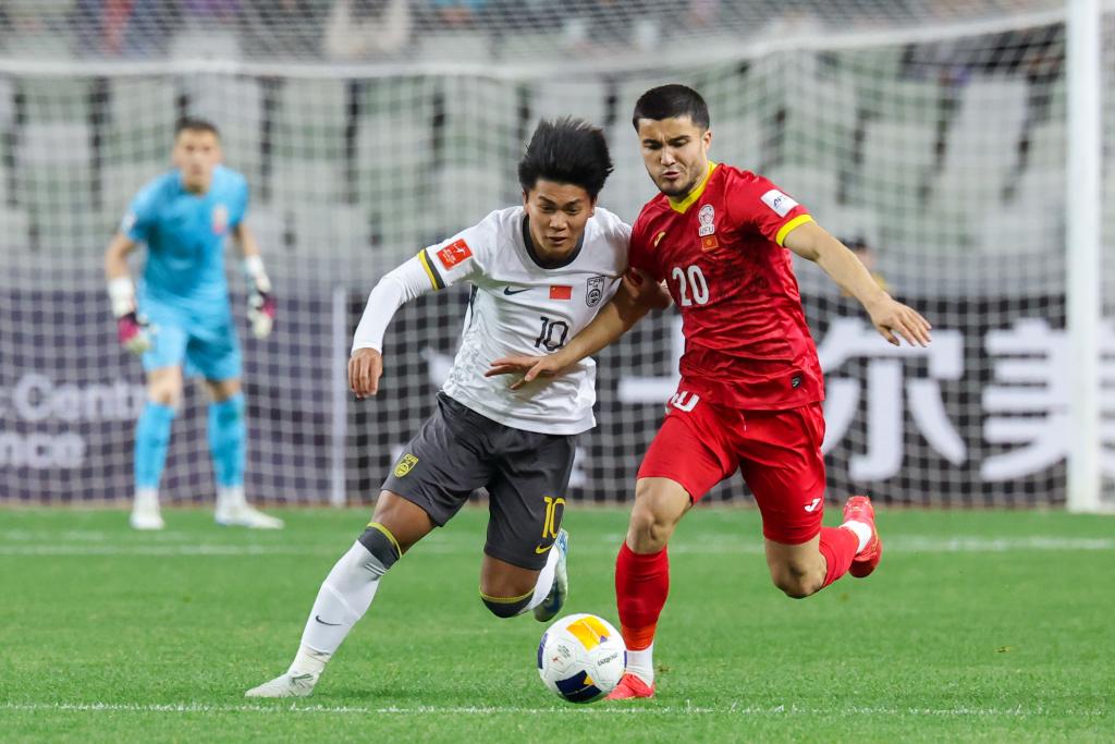 在2月15日進行的2025亞足聯(lián)U20亞洲杯小組賽中國隊對陣吉爾吉斯斯坦隊比賽中,蒯紀聞(左)與對手拼搶。新華社記者梁旭攝